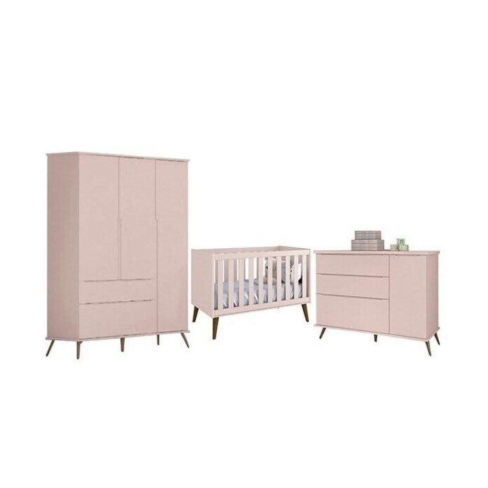 Cômoda Infantil Com Porta Retro Alice - PR Baby • 1 porta e 3 gavetas • 100% MDF 15mm • Encabeçamento lateral de 25mm • Corrediças telescópicas • Puxador modelo cava • Design moderno • Pés palitos estilo retrô • Pintura UV Guarda Roupa Infantil Retro Alice - PR Baby • 3 portas e 2 gavetas • 100% MDF 15mm • Encabeçamento lateral de 25mm • Corrediças telescópicas • Puxador modelo cava • Design moderno • Pés palitos estilo retrô • Pintura UV Berço Americano Theo com Pés Amadeirados - Reller Móveis • Certificado pelo INMETRO • Transforma-se em mini cama • Padrão Americano • Cantos arredondados • 03 regulagens de altura do estrado • Estrado em MDF • Grade Fixa • Acabamento UV (Atóxico) • Espaçamento da grade: 5,9 cm • Pés desenvolvidos em madeira maciça • Colchão Recomendado: 130 x 70 x 12 cm (Densidade: D18) • Não acompanha colchão *Berço por ser de fabricante diferente do guarda roupa e cômoda, apresenta uma pequena diferença na tonalidade. Dimensão: Tamanho da Cômoda (L x A x P): 113 x 91 x 46 cm Tamanho do Roupeiro (L x A x P): 133 x 205 x 46 cm Tamanho do Berço (L x A x P): 135 x 95 x 76 cm Garantia: 3 meses Volumes: 8 Volumes Montagem: Recomendamos que a montagem seja feita por um profissional. Recomendação de Limpeza: Utilize pano levemente úmido.