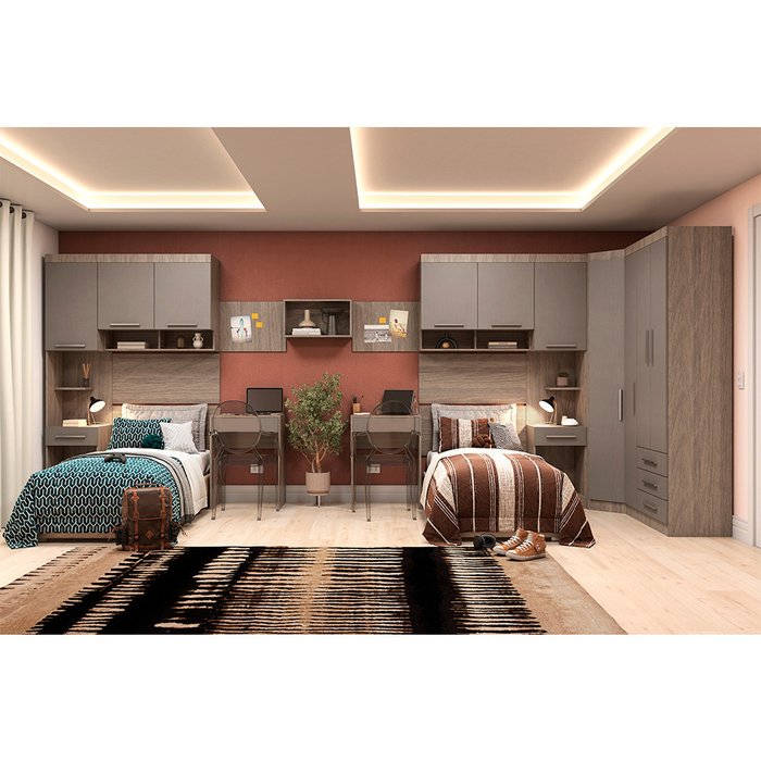 Quarto Irmãos com Guarda Roupas 10 Portas, Cabeceira e Escrivaninha Jequitibá com Fumê Fit Jequitibá com Fumê