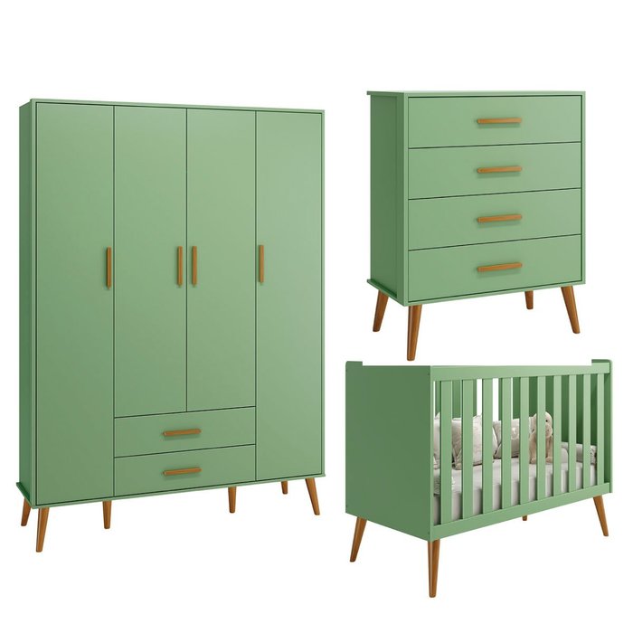Quarto Isis Berço Americano 2 em 1, Comoda Gaveteiro, Guarda Roupa Isis Retrô 4 Portas Botânico