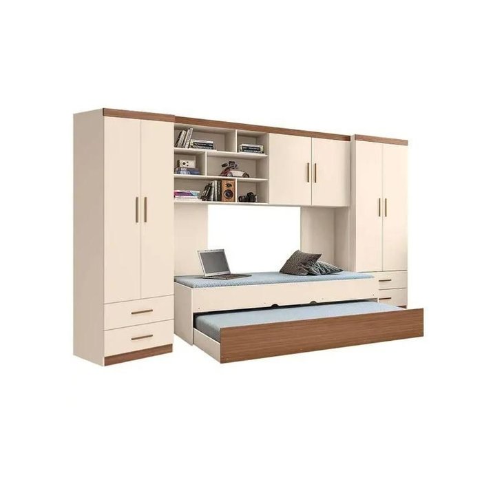Quarto Juvenil Chiara 5 Peças - 2 Roupeiro 2 Portas, Módulo Aéreo e Cama com Auxiliar - Off White Off White