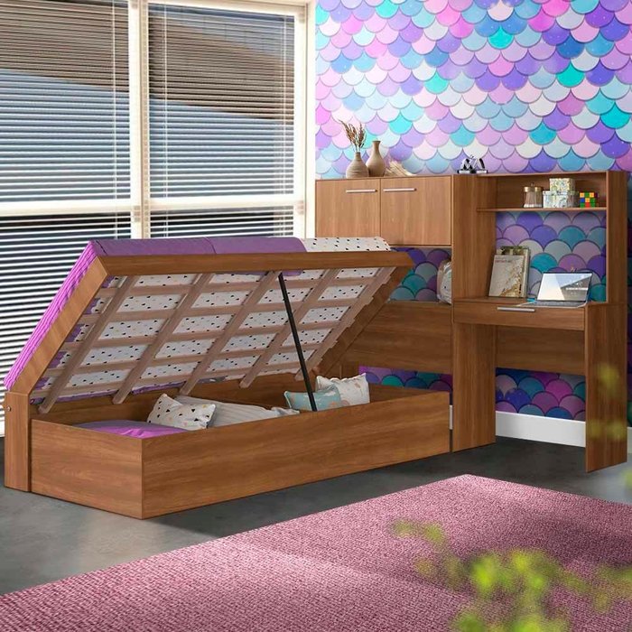 Otimizar espaços é uma de nossas metas, por isso criamos este conjunto para quarto. Produzido em excelente material MDP e acabamento em Finish Foil Acetinado, que garante maior resistência e qualidade em seu móvel. A essência de criar soluções que trazem mais conforto para sua vida é o grande diferencial dos nossos produtos. Cada nova ideia é uma mistura de criatividade, funcionalidade e muita dedicação.- Estrutura em MDP- Cama com baú amplo e espaçoso, com divisória interna- Estrado em madeira de eucalipto- Escrivaninha com gaveta- Armário 2 portas- Nichos para organização de livros e objetos decorativos- Espaço para colchão tamanho padrão solteiro (88 x 188 cm)- Não acompanha colchão- Cama suporta até 100 kg- Este conjunto para quarto é completo e versátil, perfeito para ambientes compactosDimensões da cama: Largura 90 cm; Profundidade 193 cm; Altura 40 cm; Dimensões dos baús da cama: Largura: 79; Profundidade 93; Altura 30 cm;Dimensões do móvel: Largura 166 cm; Profundidade 36 cm; Altura 136 cm;Itens inclusos: 1 cama solteiro e 1 móvel armário/escrivaninha (não acompanha colchão)Complexidade da montagem: Média, pode ser montado por apenas uma pessoa e/ou necessite de maior conhecimento para montagem.Recomendações de uso, manutenção e limpeza: Limpar com flanela ou pano macio seco, não utilizar produtos abrasivos, desengordurantes, álcool ou solvente. Não expor o produto diretamente a luz solar e à umidadeGarantia : 3 mesesOBS: Foto meramente ilustrativa, obejtos, utensílios de cozinha e decoração não fazem parte do produto.Manual De Montagem E Instalação
