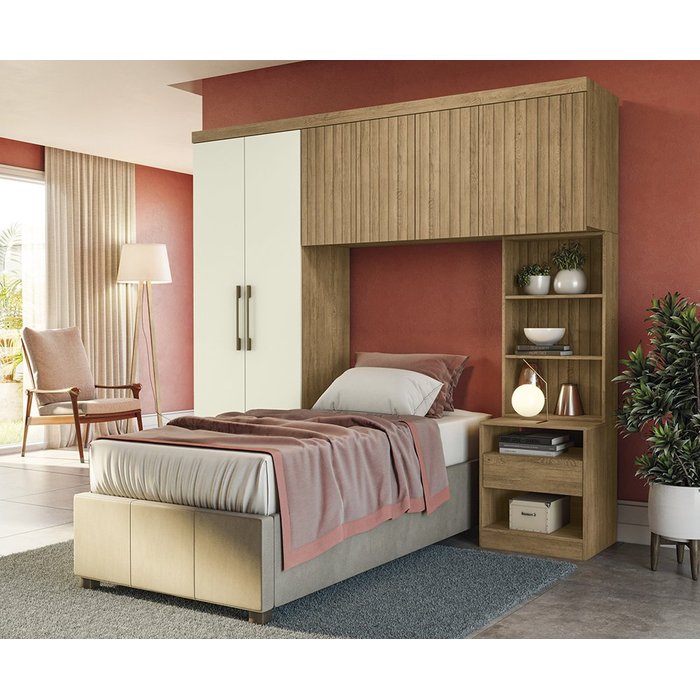 Quarto Modulado Completo Solteiro Prisma 03 Peças Freijó Off White Freijó Ripado Kappesberg