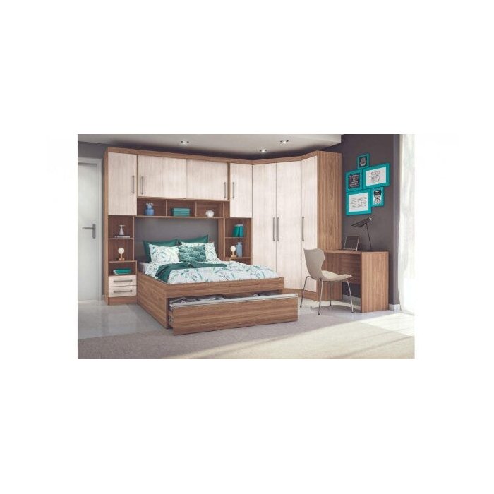 Modulado completo para dormitório. Módulos compactos, canto closet com amplo espaço interno, espaço para sapatos, 02 cabideiros em alumínio, portas com puxadores em alumínio. Ponte aéreo com portas de correr e trilhos em alumínio. Cama com gavetão para melhor acomodação dos seus pertences, com corrediças telescópicas, estrado com reforço, puxador em alumínio, rodizio inferior. Guarda roupa 01 porta com 04 prateleiras. Também, uma bancada office para seu quarto ou qualquer ambiente de sua casa.