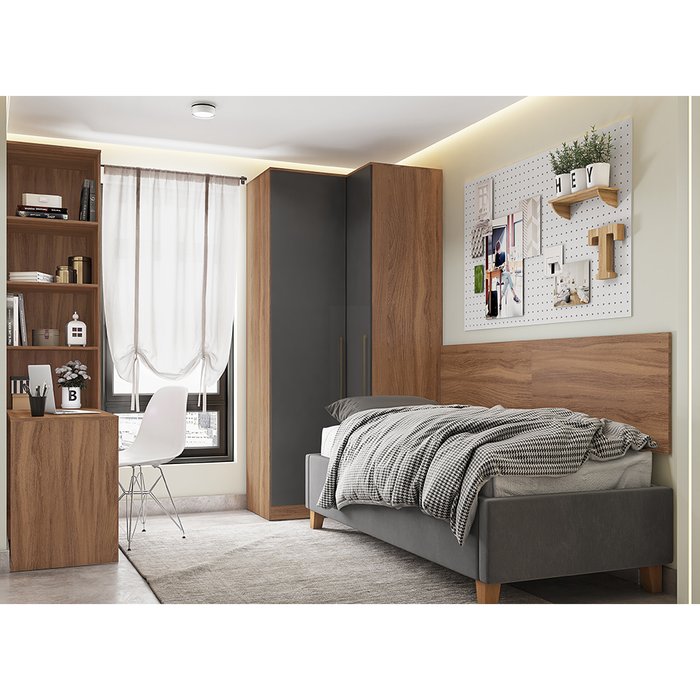 Quarto Modulado Escócia de Solteiro Mesa Escrivaninha + Guarda Roupa 2 Portas Amêndola/Grafito