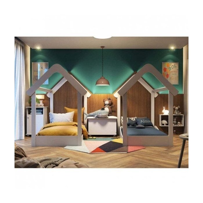 Quarto para Irmãos com 2 Camas Casinha, Baú, 2 Nichos e Mesinha de Apoio Móveis Peroba Branco