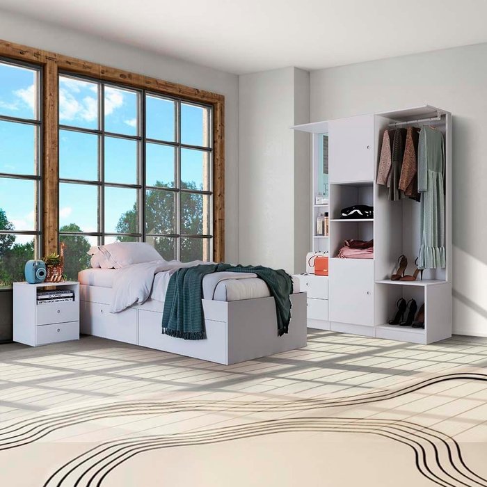 Conheça o Quarto Juvenil com Cama 80, Guarda Roupas e Mesa de Cabeceira. Foi pensado para priorizar a otimização do espaço. Dispõe de um amplo espaço interno para acomodação de seus mais diversos pertences. Contando também nessa bela aquisição, a mesa de cabeceira, para tornar o seu ambiente ainda mais charmoso e convidativo para descansos irrecusáveis. Este produto foi produzido em excelente material MDP 15 mm e com acabamento em Finish Foil Acetinado, que garante maior resistência e qualidade em seu móvel.Material de Qualidade: Fabricado em MDP, combina resistência e durabilidade para atender às suas necessidades de armazenamento.Acabamento Sofisticado: O acabamento em Finish Foil Acetinado confere uma aparência elegante ao móvel, adicionando um toque de estilo ao seu espaço.Ampla Capacidade de Armazenamento: Com 4 gavetas, 6 portas, corrediças e dobradiças metálicas, estes móveis oferecem amplo espaço para organizar suas roupas e pertences.Incluso Nichos: Complemente a funcionalidade com nichos convenientes, oferecendo espaço extra para organizar e exibir seus pertences de forma prática e acessível.Detalhes Funcionais: Os 10 puxadores em PVC embutido proporcionam uma estética clean, enquanto as prateleiras internas e externas oferecem soluções práticas para a organização.Estabilidade e Proteção: Equipado com 14 pés em PVC em sapatas, o conjunto completo mantém-se estável e protege o piso contra riscos.Compatibilidade de Colchão: Recomendado para colchões de 188cm x 78cm, garantindo um ajuste perfeito e confortável.