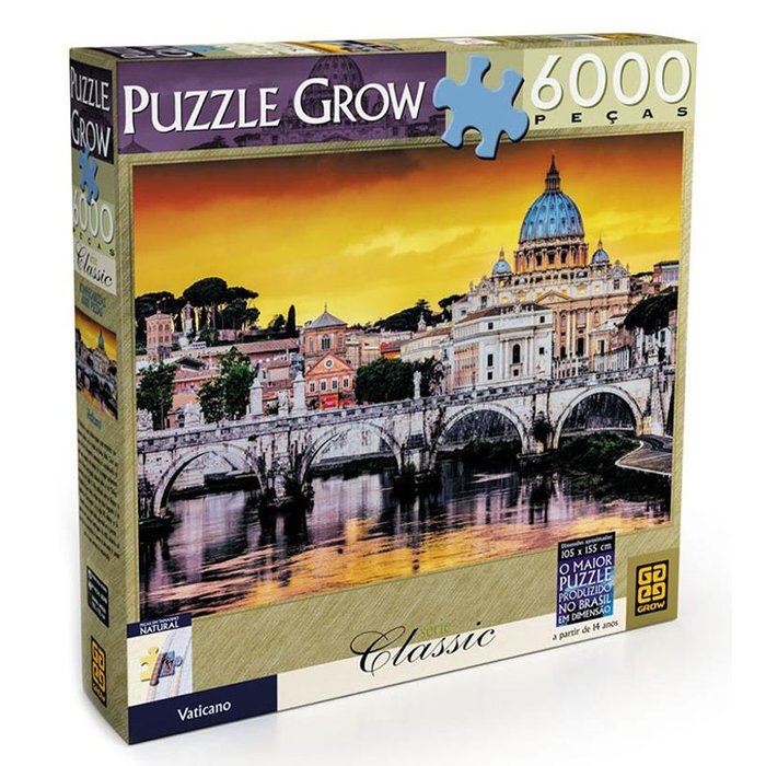 O novo quebra-cabeça de 6.000 peças é o maior já produzido pela Grow, com dimensões de 105 x 155 cm. O Vaticano é uma cidade-estado cujo território fica dentro da cidade de Roma, na Itália. Com área de 0,44 km², é considerado o menor país do mundo. Na imagem, você vê a Ponte Sant’Angelo, localizada sobre o rio Tibre, construída no século II. Muito utilizada para que pedestres chegassem à Basílica de São Pedro, recebeu do Papa Gregório I o nome de "Sant'Angelo", no século VII, devido à lenda de um anjo ter aparecido no topo do Castelo de Santo Ângelo. Em 1450, devido ao grande fluxo de peregrinos, a ponte ruiu, passando por um longo período de restauração.