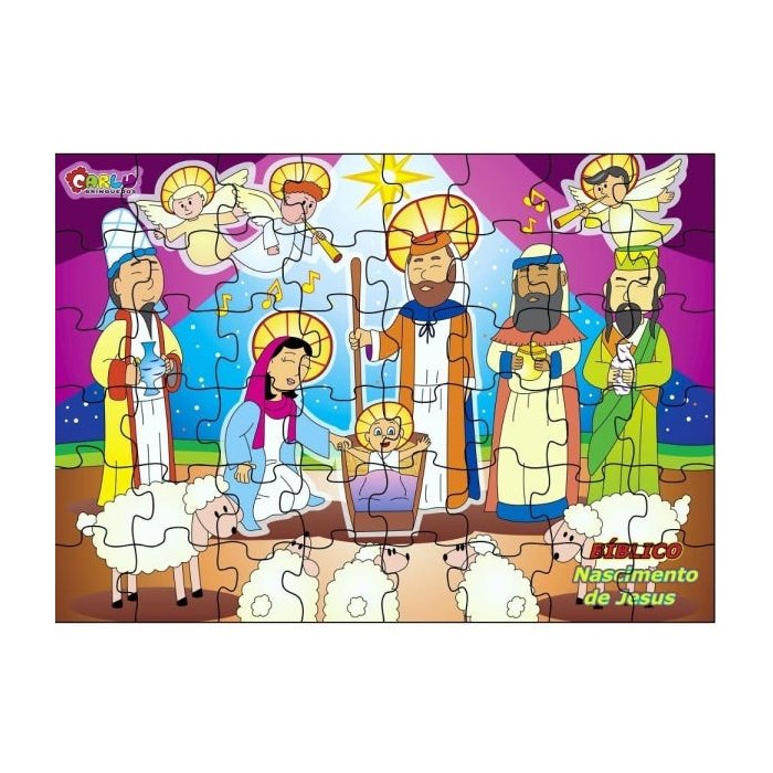 Quebra cabeça de M.D.F.. Composto por 48 peças recortadas a laser. Medidas do Quebra cabeçamontado: 49,5 x 35 cm. Embalagem: Caixa papel duplex, com ilustrações na tampa e noverso historia do nascimento de Jesus, medindo: 25 x 15 x 6 cm. Lacrada com película de P.V.C. encolhível. Produto com certificaçao do INMETRO.CE-BRI/ICEPEX - N 00928-96