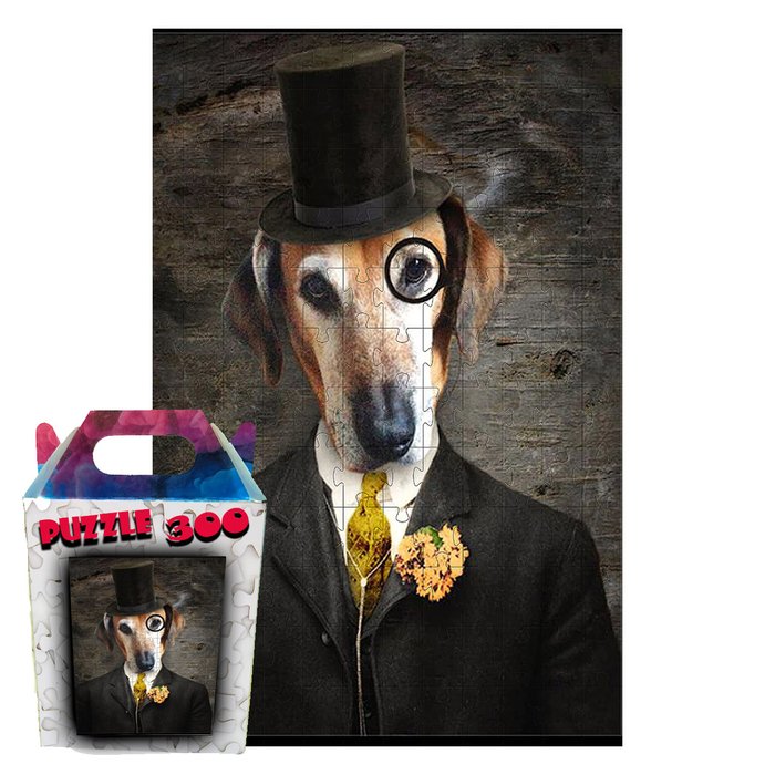 Acompanha 1 quebra-cabeça com o Tema Cachorro de chapéu 300 peças