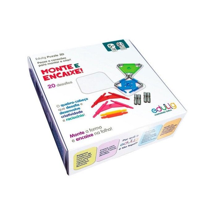 O Puzzle Edulig 3D Monte Encaixe é muito especial na sua proposta de desafiar a criança e elaborar e depois montar 20 formas que se encaixem perfeitamente nas templates.
