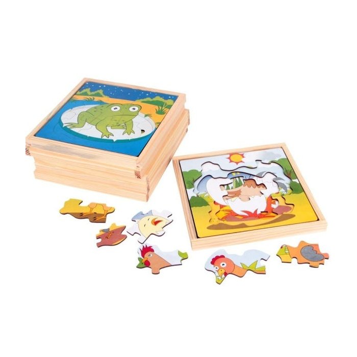 Esse tradicional jogo ficou ainda mais dinâmico, com 4 camadas de montagem e diferentes graus de dificuldade. Ele estimula a atençao, an Alise de problema, raciocínio logico e também ajuda a desenvolver habilidades espaciais nas crianças.Descritivo Detalhado: Kit confeccionado em madeira e M.D.F. Composto por 6 kits com base em baixo relevo medindo: 22,5 x 22,5 x 1,5 cm, com 24 jogos de Quebra cabeça , totalizando 122 peças, cada jogo com 04 est Agios de evoluçao, ex: Semente-broto-botao-flor. Jogos pintados e serigrafados com tinta ultravioleta atoxica colorida ilustrando os est Agio de evoluçao de uma Flor, Boi, Galo, Sapo, Milho e Borboleta. Os Jogos variam entre 01 até 07 peças. Embalagem: Caixa de papel microondulado ilustrado medindo: 23 x 23 x 11 cm. Lacrada com película de P.V.C. encolhível.CE-BRI/ICEPEX - N 00928-96