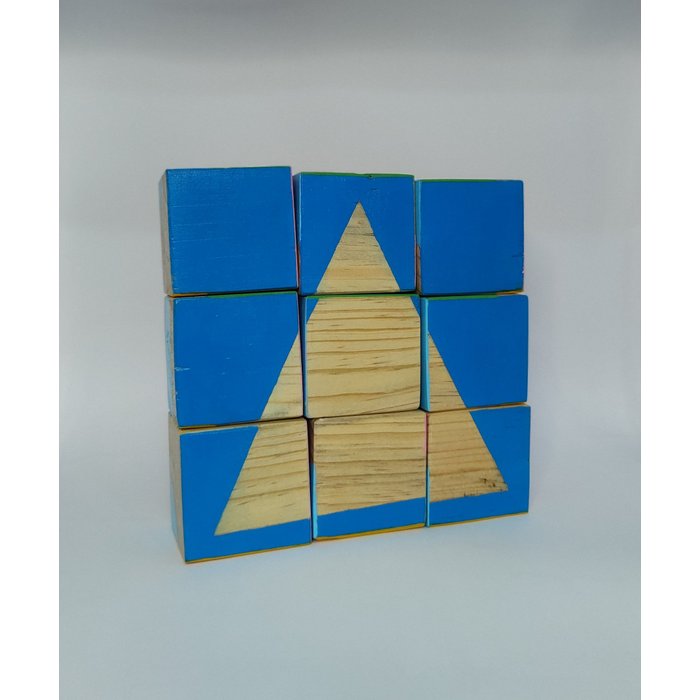 O brinquedo é composto de 9 cubos de 4,5x4,5x4,5cm que juntos formam um conjunto de 13,5x13,5x4,5cm. Cada lado dos cubos forma parte de uma forma geométrica.