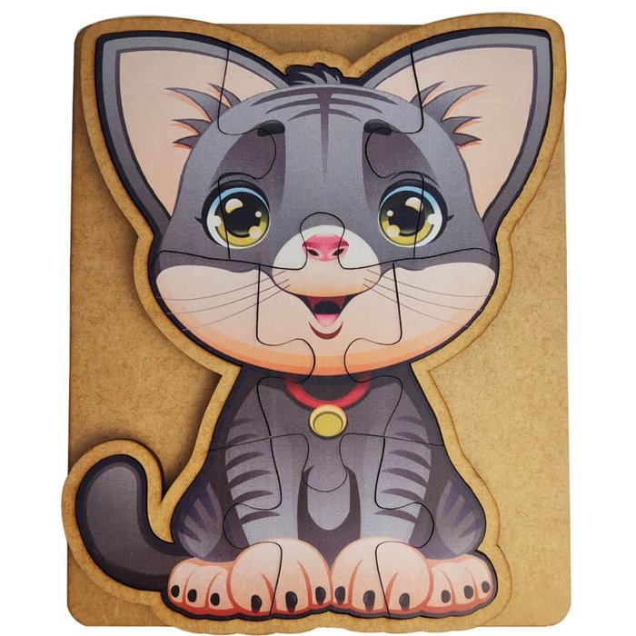 Quebra Cabeça Método Montessori Brincadeira com Aprendizado 9 Peças Nível Fácil<br><br>#Brincando de forma lúdica<br>#Aprendizado infantil<br>#Método Montessori<br><br>Garantia: 90 Dias / Peso: 468g / Cor: Cinza e Marrom / Ref: 110QBRKBCA<br>Dimensões aproximadas do quebra cabeça: 26,5cm (C) x 23,5cm (L) x 1,5cm (A)<br>Dimensões aproximadas da base externa: 27cm (C) x 24,5cm (L)<br>Dimensões da maior peça: 8,5cm (C) x 7,5cm (L) x 1,5cm (A)<br>Dimensões da menor peça: 7,5cm (C) x 7cm (L) x 1,5cm (A)<br>Espessura: 5mm<br>Estampa: Cão ou gato.<br>Observação: Quebra cabeça com 9 peças.<br><br>Conteúdo: <br>- 01 Quebra cabeça;<br>- 01 Base MDF.<br><br>Limpeza e cuidados:<br>- Não exponha sob luz direta do sol, pois este é prejudicial a longevidade do produto;<br>- Lave com pano levemente umedecido com água, seguido de pano seco;<br>- Não utilizar produtos químicos ou abrasivos na limpeza;<br>- Não submergir em água.<br><br>Detalhes do produto: <br>- Acompanha uma base de MDF com 1 quebra cabeças de nove peças que pode ser usado como quadro decorativo.<br>- Desenvolvidos em MDF com acabamento em melamina seladora (protege contra a umidade);<br>- As estampas são impressas diretamente no MDF (sem adesivo).<br><br>Materiais:<br>- Melamina;<br>- MDF.<br><br>Este jogo de quebra cabeças, além de ser lindo, tem um super diferencial: é desenvolvido em MDF com acabamento em melamina seladora, super resistente contra umidade. Pode virar um quadro no quartinho das crianças ou até mesmo na brinquedoteca. Disponível nas estampas: cão ou gato.