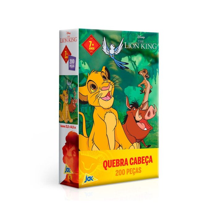 O quebra-cabeça possui 200 peças, que ao ser montado apresenta um desenho do Simba, Timão e seu amigo Pumba. As crianças podem brincar sozinhas ou com os amiguinhos. Montado o desenho tem 31 x 44 cm.