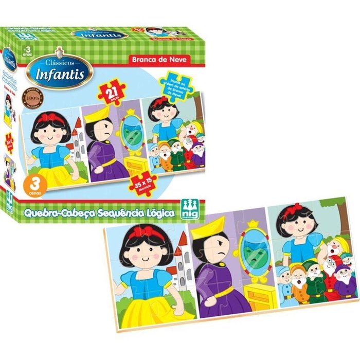 Quebra-cabeça - Sequência Lógica - Branca De Neve - Madeira - Nig Quebra-Cabeça - Sequência Lógica - Branca de Neve - Madeira - Nig Monte na ordem da estória da Branca de Neve. Quebra cabeça em formato de sequência lógica todo em madeira. Possui 3 cenas.A ;Sequencia Lógica ;desenvolve a coordenação motora, percepção visual, pensamento lógico, criatividade, estruturação tempo-espacial, previsão de situações, e associação de idéias ;sendo de uma maneira fácil e muito divertida. ;Tamanho montado: 35x15cm.Participantes: 02 ou mais jogadores.Observe atentamente a idade recomendada para o brinquedo.Ref.: 433.Conteúdo da embalagem: 21 peças em madeira.Medidas da embalagem: (CxAxL) 24 x 23 x 6 cm.Idade: a partir de 3 anos.Embalagem: caixa de papelão.Prazo de garantia: 03 meses de garantia legal.A Nig Brinquedos oferece ao seu cliente 50 anos de experiência no setor, com muitas estórias de sucesso e comprometimento com as crianças. Está localizada no interior de São Paulo, Santa Rosa de Viterbo, onde são realizadas todas as etapas da produção até embalagem e distribuição dos produtos. Toda linha de jogos e brinquedos passa pela aprovação do inmetro (instituto nacional de metrologia, normalização e qualidade industrial) com a certificação do sgq (sistema de gestão da qualidade).Pode ocorrer variação nas cores ou detalhes das imagens apresentadas para o produto.Todas as informações fornecidas são de responsabilidade do fabricante.