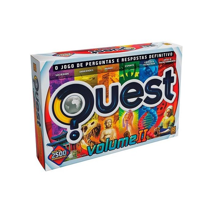 Quest Volume 2 o jogo de perguntas e respostas ! São 2640 perguntas, divididas em 6 temas diferentes: sociedade, artes e entretenimento, variedades, ciência e tecnologia, mundo e esportes Antes de responder a cada pergunta, você deve apostar a quantidade de pontos que deseja andar no tabuleiro se acertar Tem certeza de que sabe a resposta Então aposte alto! Está na dúvida Pense bem o quanto vale a pena arriscar