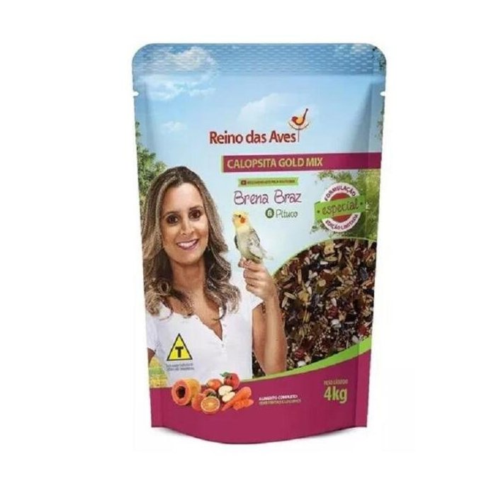 Calopsita Gold Mix Alimento para pássaros completo e balanceado indicado para: Calopsita, Agaporne, Ring Neck, Rosellas, Forpus, Red Humped e Neophemas. Composição Básica: Alpiste, Painço nacional, Painço vermelho, Painço preto, Arroz em casca, Aveia em casca, Girassol miúdo, Trigo mourisco, Cártamo, Sorgo vermelho, Maçã desidratada (min. 1,3%), Beterraba desidratada (min. 0,3%), Cenoura desidratada(min. 0,1%), Farinha de ostras, Milho moído, Farelo de trigo, Farelo de arroz, Farelo de soja, Calcário calcítico, Cloreto de sódio, Dióxido de titânio, Aditivo pigmentante (amarelo crepúsculo, vermelho 40, verde folha, amarelo tartrazina), Aroma de mel, Aditivo antifúngico (mistura dos ácidos propiônico, acético, fórmico e sórbico), Aditivo antioxidante (B.H.T).