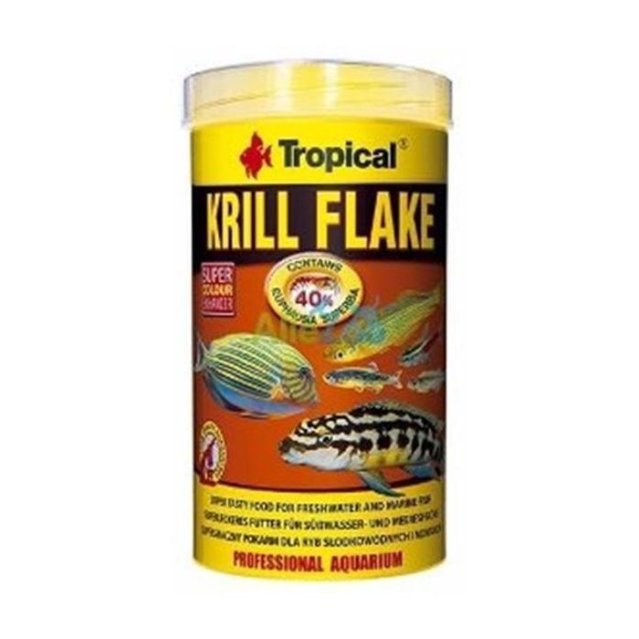 Krill Flake é uma ração em flocos que potencializa a coloração dos peixes ornamentais mais exigentes. Krill Flake é um alimento a base krill (Euphausiacea) rico em nutrientes, para peixes ornamentais carnívoros e omnívoros com elevadas necessidades nutricionais e exigentes em relação as rações industrializadas. Com múltiplos ingredientes, com alto teor de krill antártico (40%), com proteínas biológicas valiosas, ácidos graxos insaturados, ácidos gordos insaturados (incluindo Omega 3), aminoácidos e corantes naturais. O alto teor de carotenóides e a bem assimilável astaxantina (136 mg/kg) faz com que as cores dos peixes regularmente nutridos com Krill Flake ganhem intensidade e brilho. Ração especialmente balanceada tem um excelente efeito nas condições dos peixes ornamentais e na capacidade de reprodução. A dieta poderá ser alternada com outros alimentos produzidos pela TROPICAL. Indicações/recomendações: Alimentar várias vezes ao dia (2-4 vezes) em pequenas porções. Ferro 36,4 mg/kg Zinco 0,1 mg/kg Manganês 7,6 mg/kg Cobre 1,8 mg/kg Iodo 0,22 mg/kg Selénio 0,22 mg/kg Molibdênio 0,05 mg/kg Cobalto 0,01 mg/kg Proteína bruta 47,0% Matéria gorda bruta 10,5%, Fibra bruta 3,5% Umidade 6,0% Moluscos e crustáceos (farinha de krill min. 40%), peixes e subprodutos de peixes, cereais, extratos de proteínas vegetais, carnes e subprodutos animais, subprodutos de origem vegetal, algas, leveduras, óleos e gorduras, substâncias minerais. Contêm: Vitaminas, pró-vitaminas e lecitina, corantes e antioxidantes. Vitamina A 26 200 IU/kg Vitamina D3 1 570 IU/kg Vitamina E 100 mg/kg Vitamina C 525 mg/kg