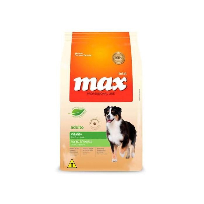 O seu melhor amigo merece uma alimentação produzida com ingredientes de primeira qualidade, vitaminas e minerais na dose certa. Para manter a saúde do seu cão em dia, manter uma pele e pelagem bonitas é ideal que ele consuma um alimento balanceado. A Total Alimentos sempre preocupada com o bem estar e saúde do seu cão desenvolve os melhores produtos. Produzidos por especialistas em alimentos para cães e gatos, a Ração Max Cães Professional Line sabor Frango e Vegetais é ideal para cães adultos contem vitaminas e minerais que melhoram a nutrição do seu cão. Com sabor irresistível, a Ração Total Max é um alimento completo para seu cão. Indicação: Cães Idade: Adultos Porte: Raças pequenas e médias Tipo de ração: Seca Sabor: Frango e Vegetais Marca: Total Alimentos Ingredientes Carne mecanicamente separada de frango (1%); Farinha de vísceras de aves; Farinha de carne e ossos; Gordura de frango; Milho integral moído**; Milho gérmen desengordurado**; Farelo de soja*; Farelo de trigo; Espinafre desidratado (0,05%); Cenoura desidratada (0,05%); Quirera de arroz; Linhaça integral moída (0,4%); Extrato de Yucca (0,025%); Fosfato bicálcico; Cloreto de sódio (sal comum); Propionato de cálcio; Aditivo Antioxidante (BHA, BHT); Palatabilizante à base de fígado de aves e suínos; Ácido fólico; Ácido pantotênico; Vitamina A; Vitamina B1; Vitamina B12; Vitamina B2; Vitamina B6; Vitamina D3; Vitamina H; Vitamina K3; Vitamina PP; Vitamina E; Sulfato de cobre; Sulfato Ferroso; Óxido de manganês; Selenito de sódio; Óxido de Zinco; Iodato de cálcio. Apresentação: Pacote 20kg