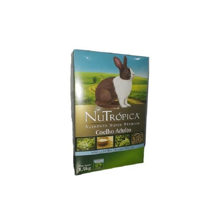 Ração Nutrópica Coelho Adulto 1,5 Kg Alimento extrusado completo, cientificamente formulado e especialmente desenvolvido para coelhos a partir de 9 meses de idade. Contém uma combinação exclusiva das mais nobres e saborosas matérias-primas não transgênicas, preparadas sob rigoroso controle de qualidade e utiliza as melhores técnicas em produção de alimentos. São mais de 30 ingredientes diferentes incluindo alfafa e vários tipos de grãos integrais como aveia, ervilha, linhaça e trigo, que juntos proporcionam os níveis ideais dos nutrientes necessários para a saúde, beleza, bem-estar e vitalidade do seu coelho. Por ser um alimento não transgênico, não utiliza milho nem soja em sua formulação.