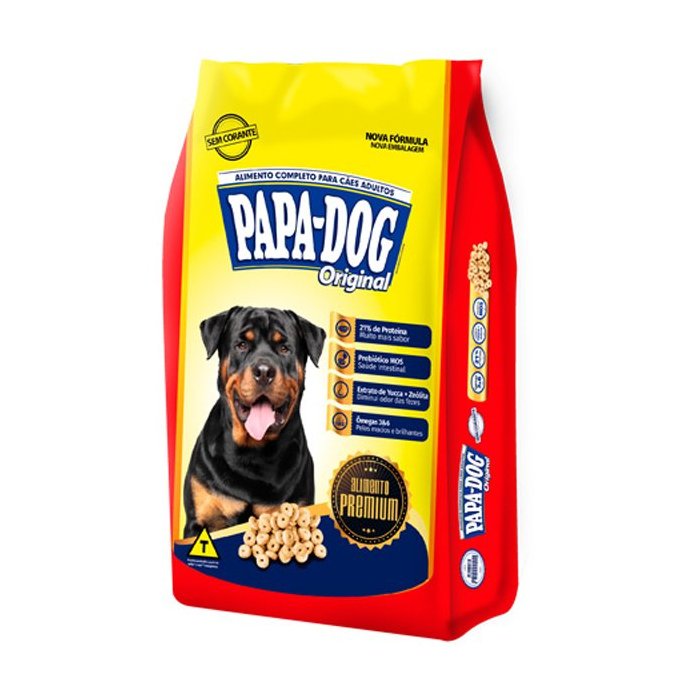 Ração Papa Dog Original para Cães Adultos 25kg Composição Básica Farinha de vísceras, farinha de carne e ossos, gordura de frango, farelo de trigo, milho integral moído, farelo de glúten de milho-21, farelo de gérmen de milho, farelo de soja, aditivo prebiótico (mananoligossacarídeos) (Mín. 0,05%), extrato de yucca (Mín. 0,04%), aditivo palatabilizante líquido (hidrolisado) de vísceras de frango, cloreto de sódio (sal comum), propionato de cálcio, sulfato ferroso, sulfato de cobre pentahidratado, sulfato de manganês, óxido de zinco, sulfato de cobalto, iodato de cálcio, selenito de sódio, vitamina A, vitamina D3, vitamina E, vitamina K3, vitamina B1, vitamina B2, vitamina B6, vitamina B12, ácido fólico, ácido nicotínico, ácido pantotênico, biotina, aditivo aromatizante (aroma de alho), aditivos antioxidantes (B.H.T./B.H.A.)