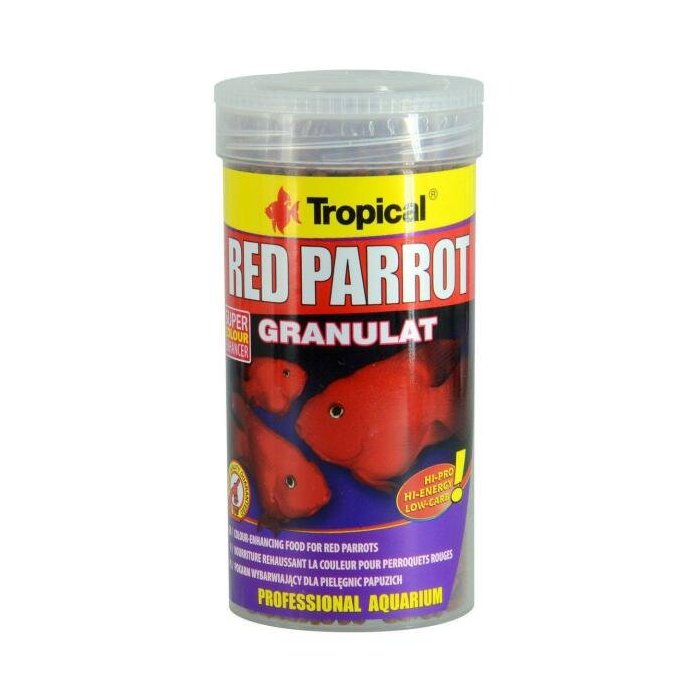 Ração Para Peixes Papagaio Tropical Red Parrot Granulat 100G Alimento promotor da cor para peixes red parrot, um alimento composto, completo, em forma de flocos flutuantes. É recomendado para a alimentação diária de red parrot e outros peixes ornamentais cuja dieta exija uma determinada quantidade de carotenoides, naturais e ácidos garaos não saturadas. A formula optimizada assegura aspectos saudável e uma excelente condição física aos peixes alimentados regularmente. A adição de zeolito influencia positivamente o sistema digestivo e a eliminação de toxinas do organismo dos peixes. Como usar: Adicionar de 2 a 3 vezes ao dia na quantidade suficiente para que possa ser consumida em pouco tempo.