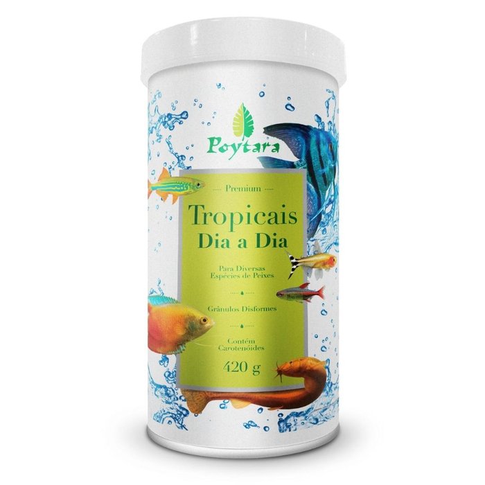 Poytara Tropicais Dia a Dia é um alimento extrusado completo, desenvolvido e aprimorado para os habitantes de aquários comunitários, com base em estudos das médias das exigências nutricionais das mais diversas espécies.