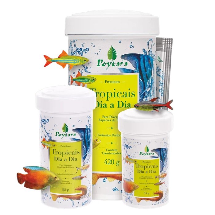 Indicado para peixes; Ideal para habitantes de aquários comunitários; Composto por pequenas partículas que possibilitam a alimentação de todos; Alimento extrusado completo. Poytara Tropicais Dia a Dia é um alimento extrusado completo, desenvolvido e aprimorado para os habitantes de aquários comunitários, com base em estudos das médias das exigências nutricionais das mais diversas espécies. Composto por pequenas partículas disformes semiflutuantes que afundam lentamente e possibilitam que os peixes de todos os níveis da coluna de água se alimentem pacificamente. A Poytara considerou a exigência das espécies de peixes tropicais, sua dieta na natureza e os ingredientes mais assimiláveis pelas diferentes espécies, e desenvolveu uma formulação contendo artrópodes, ingredientes purificados e ingredientes incontestáveis quanto aos seus resultados. Como farinha de peixe, farinha de salmão, farinha de lula, farinha de artêmia, betacaroteno, páprica, extrato de yucca e astaxantina. Com ingredientes naturais e altamente selecionados tornam este alimento completo para uma nutrição de qualidade, além de suplementação de aditivos nutricionais que melhoraram a imunidade e proporcionam o realce das cores. Especificações Idade: Adulto, Sênior e Filhote Linha: Premium Pet: Peixes Tipo: Alimento Indicação: Indicado para peixes Quantidade Diária Recomendada: 2 a 4 vezes ao dia sem sobras Espécie: Aquarios comunitarios / todas especies de peixes Apresentação: Disponível em embalagens com 15g, 35g, 95g e 420g Composição: Amido de Milho, Astaxantina, Betacaroteno, Calcário Calcítico, Dl-Metionina, Extrato de Levedura, Farelo de Soja, Farinha de Artêmia, Farinha de Peixe, Farinha de Trigo, L-Lisina, Milho, Óleo de Peixe, Páprica, Protenose, Quirera de Arroz, Sal, Extrato de Yucca, Premix Vitamínico Mineral e Aditivos Conservantes, Antioxidante, Adsorvente de Micotoxinas, Probiótico, Prebiótico e Multienzimático. Níveis de Garantia: Umidade g/kg (máx.) 150; PB g/kg (mín.) 325; EE g/kg (mín.) 40; FB g/kg (máx.) 30; MM g/kg (máx.) 80; Ca g/kg (mín.) 16; Ca g/kg (máx.) 18; P g/kg (mín.) 10; Dl metionina mg/kg 800; L lisina g/kg 19,5; Beta Glucanos mg/kg (mín.) 180; Saccharomyces cerevisiae UFC/kg 8x108; Enterococcus faecium UFC/kg 4x107; Lactobacillus acidophilus UFC/kg 4x107; Mananas (mg/kg) 480; Pectinase (u/kg) 1200; Protease (u/kg) 210; Fitase (u/kg) 90; Betaglucase (u/kg) 60; Xilanase (u/kg) 30; Celulase (u/kg) 12; Amilase (u/kg) 8 Informações Nutricionais: VITAMINA A UI/kg (mín.) 17500; VITAMINA D3 UI/kg (mín.) 4375; VITAMINA E UI/kg (mín.) 218,75; VITAMINA K3 mg/kg (mín.) 21,875; VITAMINA B1 mg/kg (mín.) 32,8125; VITAMINA B2 mg/kg (mín.) 32,8125; VITAMINA B6 mg/kg (mín.) 21,875; VITAMINA B12 μg/kg (mín.) 43,75; VITAMINA C mg/kg (mín.) 500; NIACINA mg/kg (mín.) 175; ÁCIDO PANTOTÊNICO mg/kg (mín.); 87,5; ÁCIDO FÓLICO mg/kg (mín.) 10,9375; BIOTINA mg/kg (mín.) 1,09375; COLINA mg/kg (mín.) 875; COBRE mg/kg (mín.) 10,9375; FERRO mg/kg (mín.) 109,375; MANGANÊS mg/kg (mín.) 32,8125; COBALTO mg/kg (mín.) 0,21875; IODO mg/kg (mín.) 1,09375; ZINCO mg/kg (mín.) 109,375