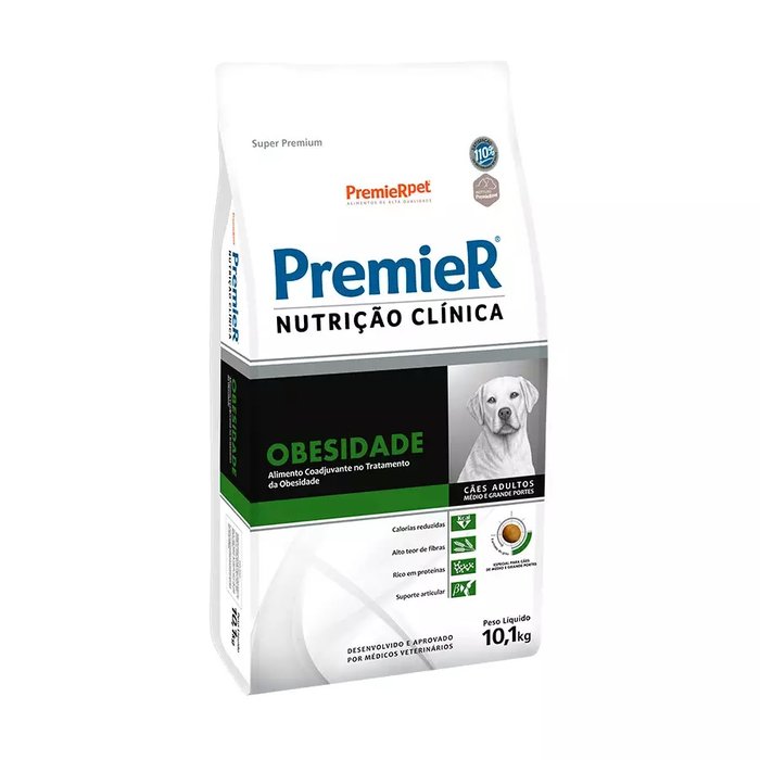 Premier Nutrição Clínica Obesidade. Premier Obesidade é um alimento coadjuvante indicado para cães adultos de grande porte com excesso de peso, para a obtenção do escore corporal ideal. Este alimento pode ser também indicado nos casos de constipação responsiva a fibras e hiperlipidemia.