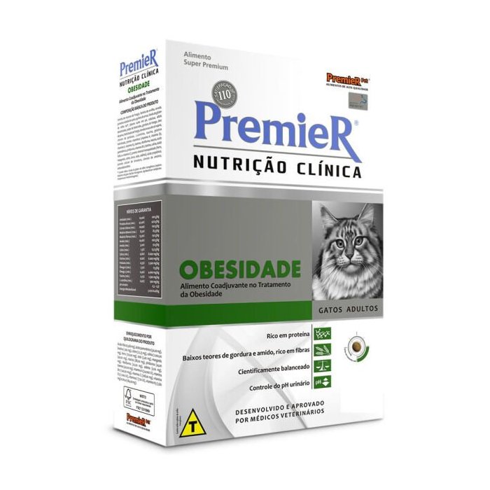 PremieR Nutrição Clínica Gatos Obesidade é um alimento Super Premium auxiliar ao tratamento de gatos adultos com excesso de peso para a obtenção do peso ideal. Uma alimentação específica para perda de peso é essencial para o tratamento da obesidade por oferecer quantidade controlada de alimento com calorias reduzidas e por fornecer todos os nutrientes necessários para perda de peso gradativa e saudável. Este produto deve ser utilizado como auxiliar, portanto não substitui o tratamento convencional.