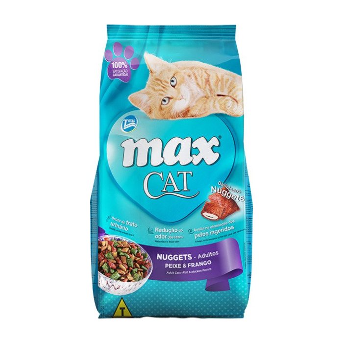 Ração Premium Espcial para gato Max Cat Nuggets é tudo que seu gato sempre quis em uma ração, com toda a nutrição que ele precisa! Max Cat Nuggets é uma deliciosa nutrição diária com recheio macio e muito sabor! Esse alimento ainda reduz o odor das fezes e auxilia na eliminação de pelos ingeridos. Se seu gato falasse ele pediria Max Cat Nuggets! Sabor: Peixe e frango Embalagem de 8kg.