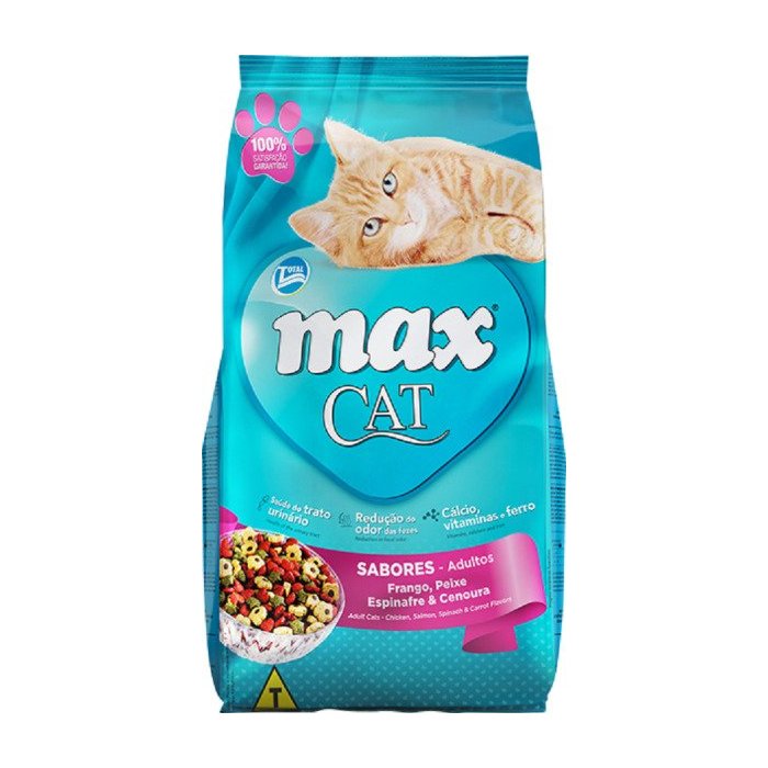 Ração Premium Especial Max cat sabores é uma ração deliciosa para gatos, com sabores muito especiais: Frango, peixe, espinafre e cenoura. Só um produto assim tão saboroso para deixar seu gato feliz! Mantém a saúde do trato urinário, redução do odor das fezes e cálcio, vitaminas e ferro. Embalagem de 8 kg.