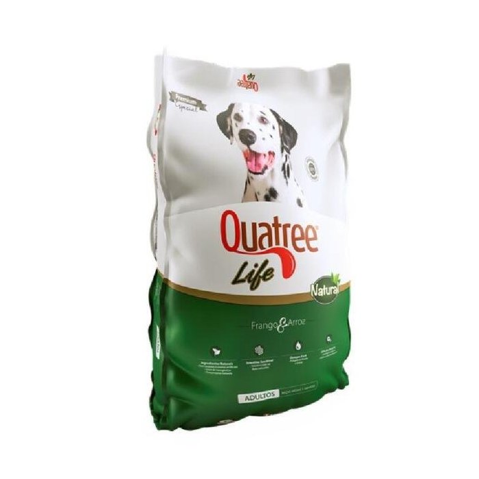Quatree Life é um alimento Premium Especial elaborado com ingredientes criteriosamente selecionados que garantem uma dieta balanceada e natural ao seu pet. É livre de ingredientes transgênicos, corantes e aromatizantes artificiais. Possui conservantes naturais, proporcionando uma alimentação saudável ao seu cão. É um alimento com alta concentração de arroz, contribuindo para melhor digestibilidade e deixando as fezes firmes e com menor volume. Contém proteínas nobres obtidas a partir das farinhas de vísceras de frango e proteína isolada de suíno. É rico em ômegas 3 e 6, importantes para a saúde da pele e para uma pelagem brilhante e macia. Quatree Life é um alimento natural com qualidade superior, sabor irresistível e que proporciona alto desempenho para o seu pet. A melhor opção para que seu cão possa desfrutar de uma dieta balanceada e naturalmente saudável, possibilitando a ele uma vida mais longa e feliz.