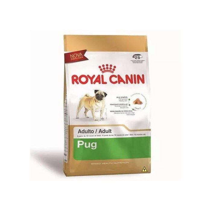 A Ração Royal Canin para Cães Adultos da Raça Pug, é especifica para está raça, que com sua cabeça ampla e focinho muito curto, o Pug é considerado uma raça branquicefálica. O tamanho, o formato e a textura dos croquetes do produto Pug 25 facilitam sua preensão e estimulam a mastigação. Royal Canin: Royal Canin é um fabricante e fornecedor mundial de alimentos de alta qualidade nutricional para cães e gatos com venda exclusiva em petshops e clínicas veterinárias. Com sua sede na França, possui 11 fábricas ao redor do mundo, incluindo a de Descalvado Brasil.As dietas nutricionais Royal Canin são desenvolvidas para solucionar as necessidades dos cães e gatos.Cada um dos alimentos é baseado no conhecimento e respeito pelos animais, adquirido através de anos de estudos no centro de pesquisa da Royal Canin, nas parcerias com as principais escolas e universidades veterinárias e, na contínua contribuição de veterinários e criadores ao redor do mundo