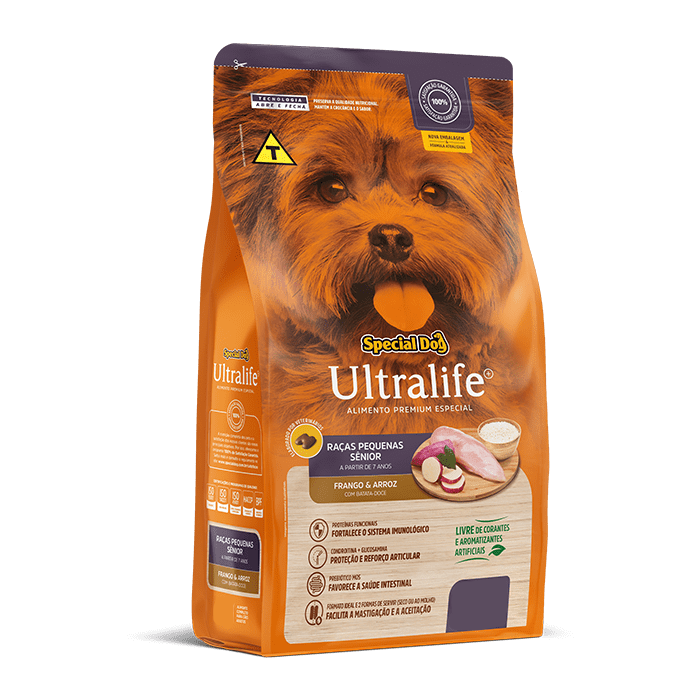 SPECIAL DOG ULTRALIFE RAÇAS PEQUENAS SÊNIOR PREMIUM ESPECIAL Não contém corantes artificiais; Elaborado por veterinários; PROTEÍNAS FUNCIONAIS Fortalece o sistema imunológico! CONDROITINA + GLICOSAMINA Proteção e reforço articular! PREBIÓTICO MOS Favorece a saúde intestinal! ÔMEGAS 3, 6 E ZINCO Pele protegida e pelos mais bonitos! 25% DE PROTEÍNA 25% de proteína de alta qualidade! 100% DE SATISFAÇÃO GARANTIDA