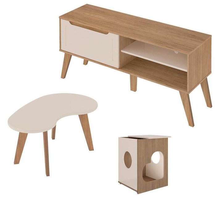 Características adicionais: Rack - Para para TV até 60 polegadas; Porta basculante; Pés em MDF 25mm; Detalhes em baixo relevo; pintura UV com acabamento fosco | Mesa de Centro - Produto em MDF; Formato curvo, leve e atual; Tampo e pés de MDF 25mm; Bordas boleadas | Mesa de Apoio - Pode ser usada como mesa de apoio e/ou casinha para pets; O tampo pode ser montado para esquerda ou direita; Espaço para armazenamento embaixo do tampo; Recorte em forma de coração.