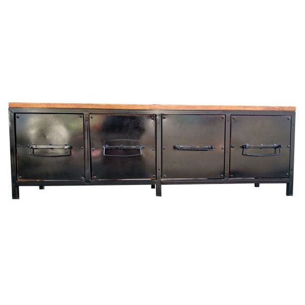 - as frentes das gavetas são revestidas por chapas lisas de ferro e puxadores soldados à elas. Também com pintura em preto eletrostático