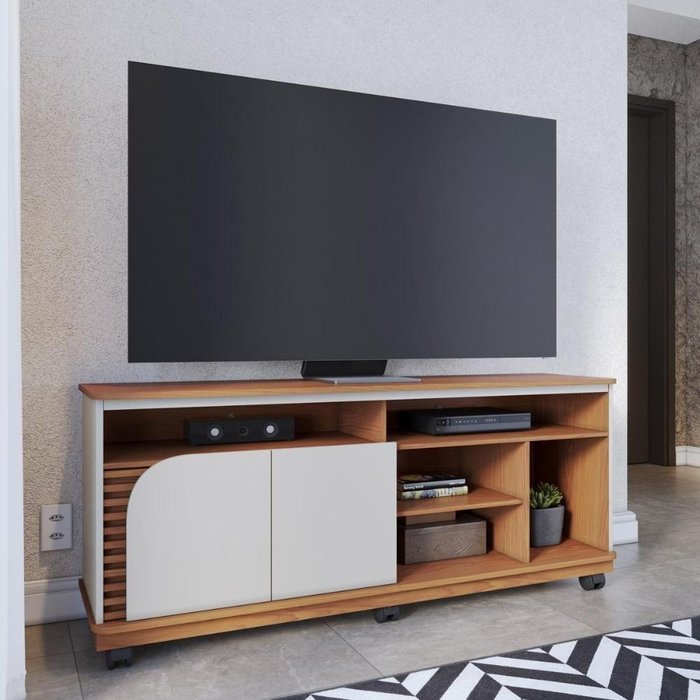 Rack Bancada Jurerê 1.5 para TV até 65” - Colibri A Bancada Jurerê é uma peça contemporânea e elegante, destacando-se pelos apliques ripados decorativos e pela porta de quina assimétrica usinada. Seu tampo de 25mm com detalhes suspensos adiciona sofisticação, enquanto o nicho espaçoso com duas portas de giro oferece praticidade para aparelhos e decorações. Com amplo espaço para TV até 65” e 6 rodízios inclusos para versatilidade, a Bancada Jurerê é a escolha perfeita para transformar seu ambiente com estilo e funcionalidade. Características: - Estrutura em MDP 25mm, 15mm e 12mm, MDF 15mm e HDF 3mm