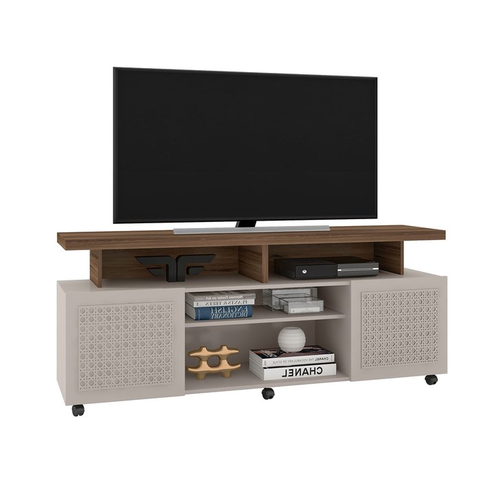 Rack Bancada Para Tv Até 65 Polegadas 2 Portas Com Rodízios Gliss - Grappa Móveis: Off White/Canela