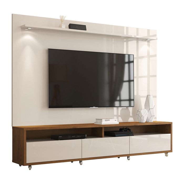 O Rack com Painel 2.2 Aspen - MoveisAqui possui design moderno que conta com três gavetas, dois nichos e uma prateleira com LED que o tornam o móvel ideal para sua sala de estar. Seu amplo espaço acomoda diversos equipamentos eletrônicos, objetos pessoais e decorativos, seus rodízios facilitam a limpeza e deixam ainda mais charmoso. Dimensões do Painel Montado: Altura: 135 cm; Largura: 218 cm; Profundidade: 17,6 cm. Dimensões do Rack Montado: Altura: 56 cm; Largura: 218 cm; Profundidade: 38,4 cm. Observações: - Fabricado em MDP; - Possui nichos; - 8 Rodízios; - Ideal para TVs de até 75"; - Corrediças telescópicas; - Pintura ultravioleta com acabamento amadeirado na cor madeiro canela; - Pintura ultravioleta com acabamento brilho na cor off white.