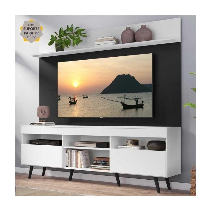 Rack com Painel e Suporte para TV até 65 Polegadas Madri Multimóveis Branco/Preto com Prateleira e P