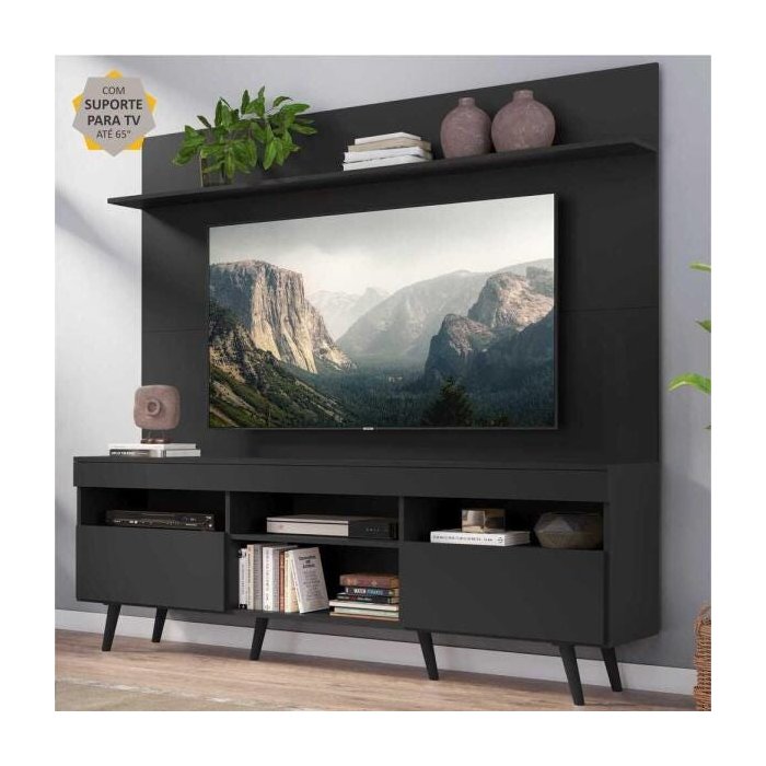 Rack com Painel e Suporte para TV até 65 Polegadas Madri Multimóveis Pés Retrô e Prateleira Preto