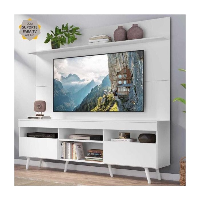 Rack com Painel e Suporte TV 65 Polegadas Madri Multimóveis Pés Retrô e Prateleira Branco