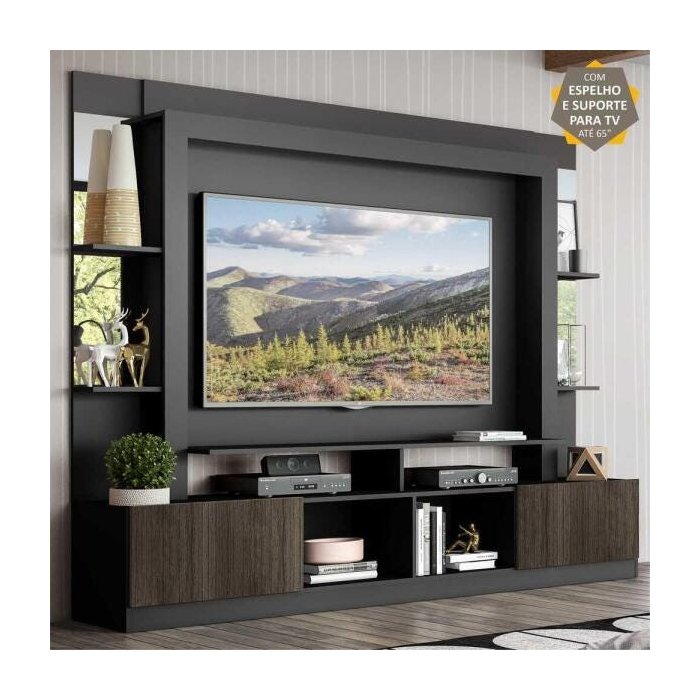 Rack com Painel e Suporte TV 65 Polegadas Prateleiras com Espelho Oslo Multimóveis Preto/Tenerife