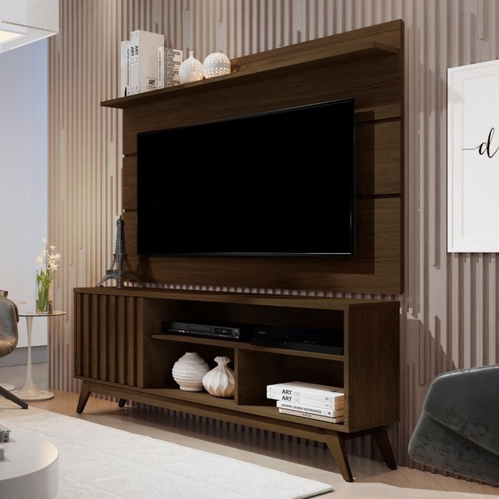 Com capacidade para TV até 50 Polegadas, o rack com painel conta com uma prateleira, uma porta com dobradiças metálicas e três nichos que tem um ótimo espaço. Assim, há espaço de sobra para a disposição dos itens decorativos e equipamentos.