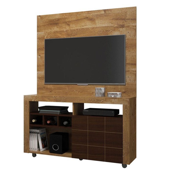 -Produzido em Mdp e Mdf que proporcionam maior resistência contra empenamento e melhoracabamento nas bordas e superfícies e ainda é proveniente de madeira de reflorestamento e que nãocoloca o meio ambiente em risco, diminuindo o desmatamento.-Impressão ultravioleta com 08 camadas que garantem maior resistência, alta definição e mais vida paraseu móvel.-Furação para passagem de cabos mantém os fios mais organizados e escondidos.-Rodízios, que facilitam a movimentação do móvel na hora da limpeza.-Espaço adega para organizar suas garrafas e mantê-las sempre ao alcance.-Porta com frisos decorativos em baixo relevo.-Largura produto montado: 108cm-Altura produto montado: 157cm (Rack 67cm / Painel 90cm)-Profundidade produto montado: 35cm-Peso do produto sem embalagem: 32,40kg