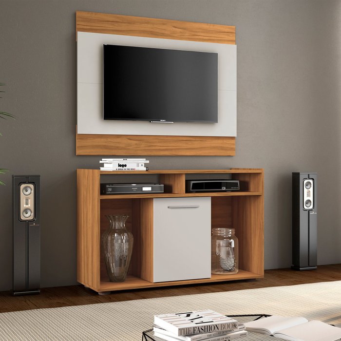 Conjunto Show da Notável Móveis é um produto muito compacto o qual é muito útil para quem tem um espaço pequeno, além disso esse produto tem um visual muito bonito e com espaços bem uteis, o mesmo tem espaço para aparelhos eletrônicos e possui pés o qual ajuda muito na hora da limpeza