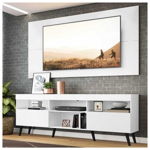 Produzido em MDP com pintura UV, que garante maior durabilidade e facilidade na limpeza, possui espaço para os equipamentos eletrônicos e nichos para objetos decorativos, além de duas portas articuladas com um amplo espaço interno para manter seus pertences organizados. O painel para TV de até 65” possui espaçamento para passagem dos fios, que permite deixar os cabos mais organizados. Devido as variações de tamanho dos televisores no mercado, sugerimos que verifique as medidas da sua TV e compare com o painel antes de efetuar a compra. Os pés palito, estilo retrô, em polipropileno, dão um charme especial ao móvel deixando-o com um visual leve e permitindo você compor um ambiente com ar vintage e moderno ao mesmo tempo.