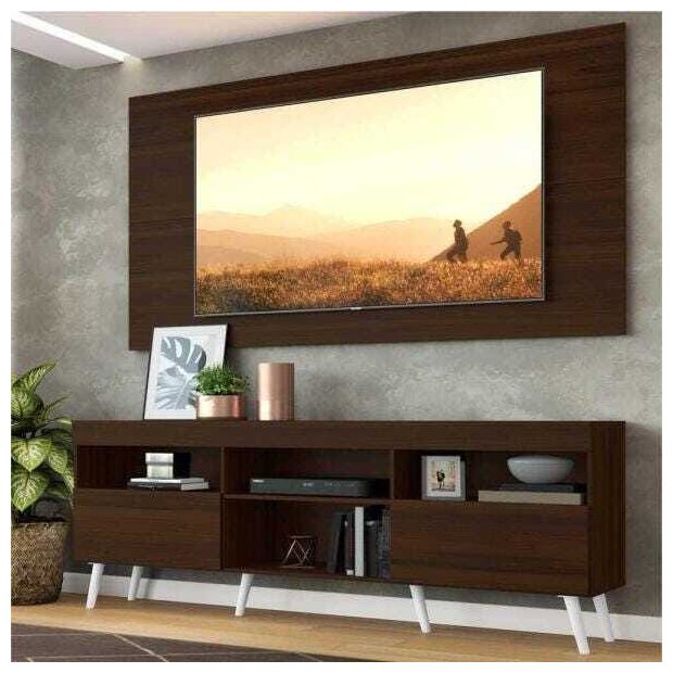 Produzido em MDP com pintura UV, que garante maior durabilidade e facilidade na limpeza, possui espaço para os equipamentos eletrônicos e nichos para objetos decorativos, além de duas portas articuladas com um amplo espaço interno para manter seus pertences organizados. O painel para TV de até 65” possui espaçamento para passagem dos fios, que permite deixar os cabos mais organizados. Devido as variações de tamanho dos televisores no mercado, sugerimos que verifique as medidas da sua TV e compare com o painel antes de efetuar a compra. Os pés palito, estilo retrô, em polipropileno, dão um charme especial ao móvel deixando-o com um visual leve e permitindo você compor um ambiente com ar vintage e moderno ao mesmo tempo.