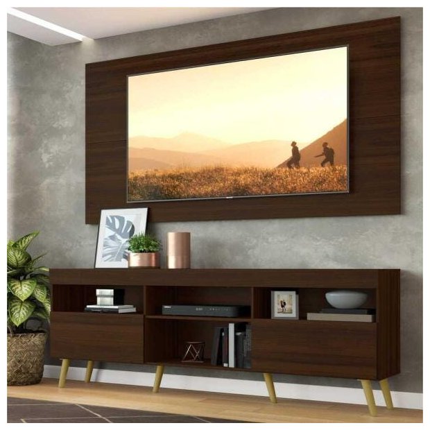 Produzido em MDP com pintura UV, que garante maior durabilidade e facilidade na limpeza, possui espaço para os equipamentos eletrônicos e nichos para objetos decorativos, além de duas portas articuladas com um amplo espaço interno para manter seus pertences organizados. O painel para TV de até 65” possui espaçamento para passagem dos fios, que permite deixar os cabos mais organizados. Devido as variações de tamanho dos televisores no mercado, sugerimos que verifique as medidas da sua TV e compare com o painel antes de efetuar a compra. Os pés palito, estilo retrô, em polipropileno, dão um charme especial ao móvel deixando-o com um visual leve e permitindo você compor um ambiente com ar vintage e moderno ao mesmo tempo.
